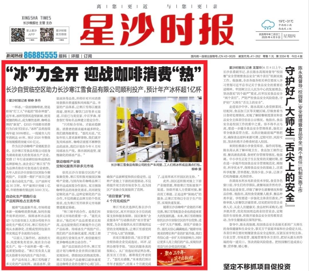 作为长沙县咖啡产业链配套企业,长沙寒江雪食品有限公司前身为湖南省最大的食用冰生产企业。凭借17年行业深耕经验和成熟的品牌影响力,该企业以“寒江雪”作为品牌名称在可食用冰行业销售,去年入驻长沙自贸临空区到如今顺利投产,目前第一期扩产项目已建成6条自动化生产线,日产冰杯可达30万杯,年产量预计突破1亿杯,年销售额有望达到5000万元。