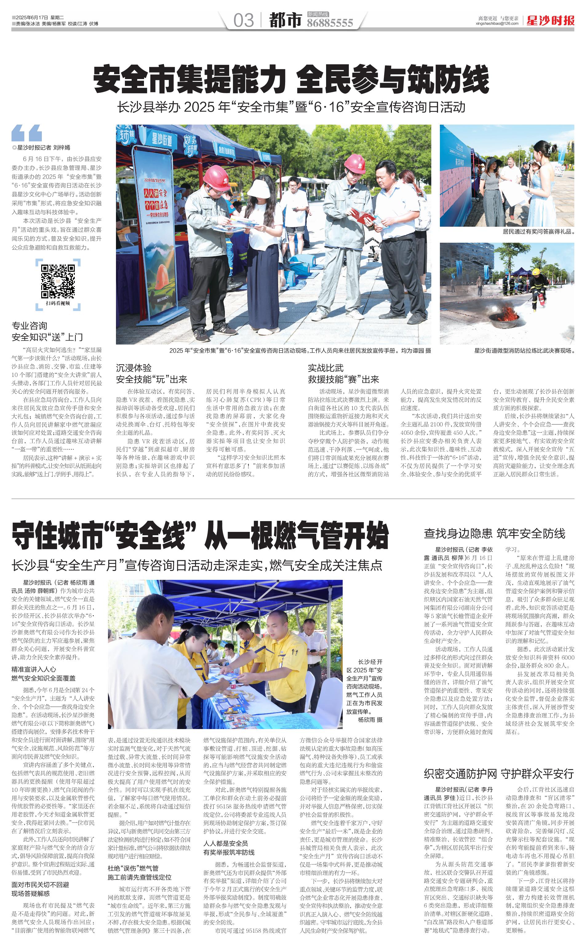 “高层火灾如何逃生?”“家里漏气第一步该做什么?”活动现场,由长沙县应急、消防、交警、市监、住建等10个部门搭建的“安全大讲堂”前人头攒动,各部门工作人员针对居民最关心的安全问题开展咨询服务。
