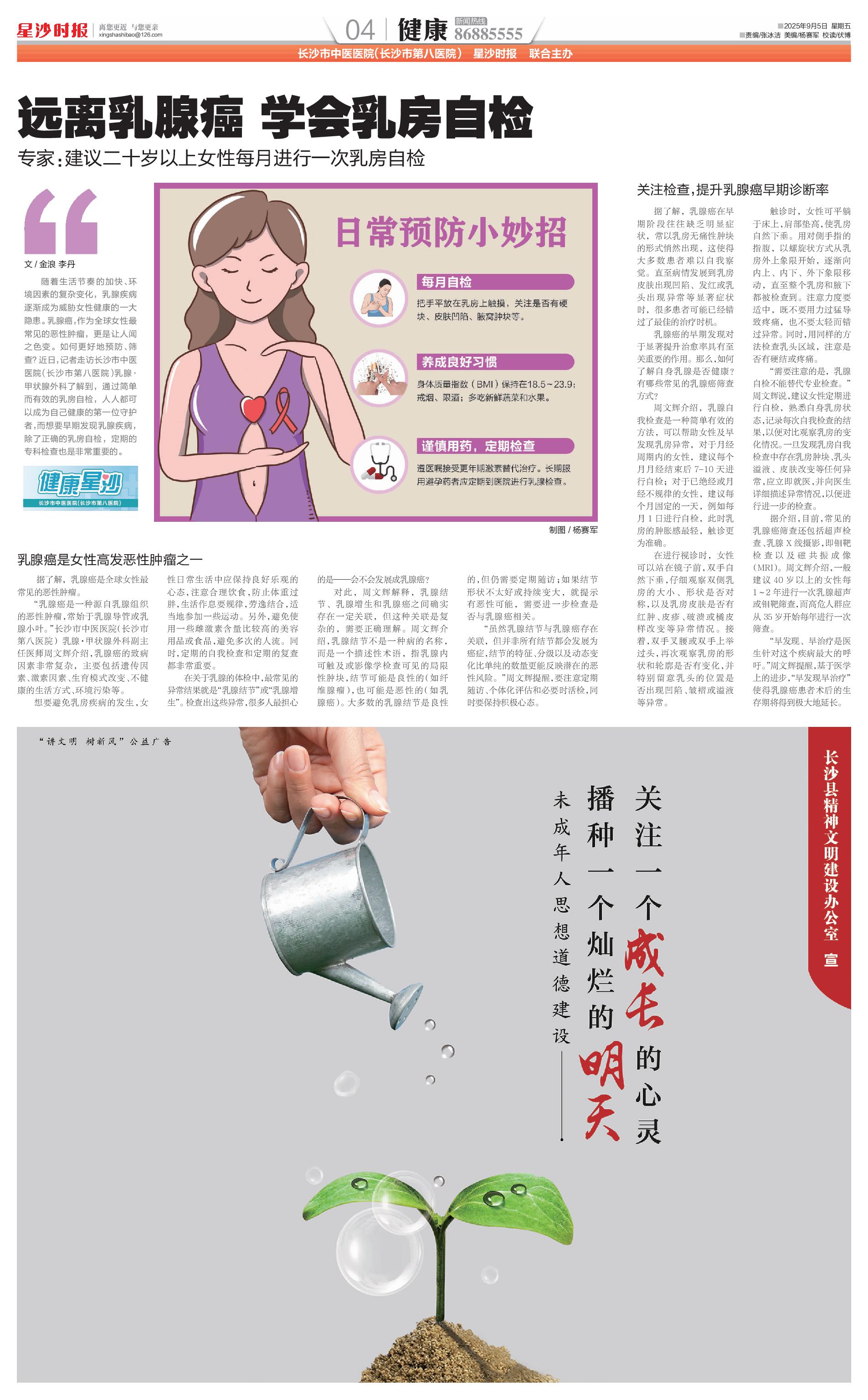 随着生活节奏的加快、环境因素的复杂变化,乳腺疾病逐渐成为威胁女性健康的一大隐患。乳腺癌,作为全球女性最常见的恶性肿瘤,更是让人闻之色变。如何更好地预防、筛查?近日,记者走访长沙市中医医院(长沙市第八医院)乳腺·甲状腺外科了解到,通过简单而有效的乳房自检,人人都可以成为自己健康的第一位守护者,而想要早期发现乳腺疾病,除了正确的乳房自检,定期的专科检查也是非常重要的。