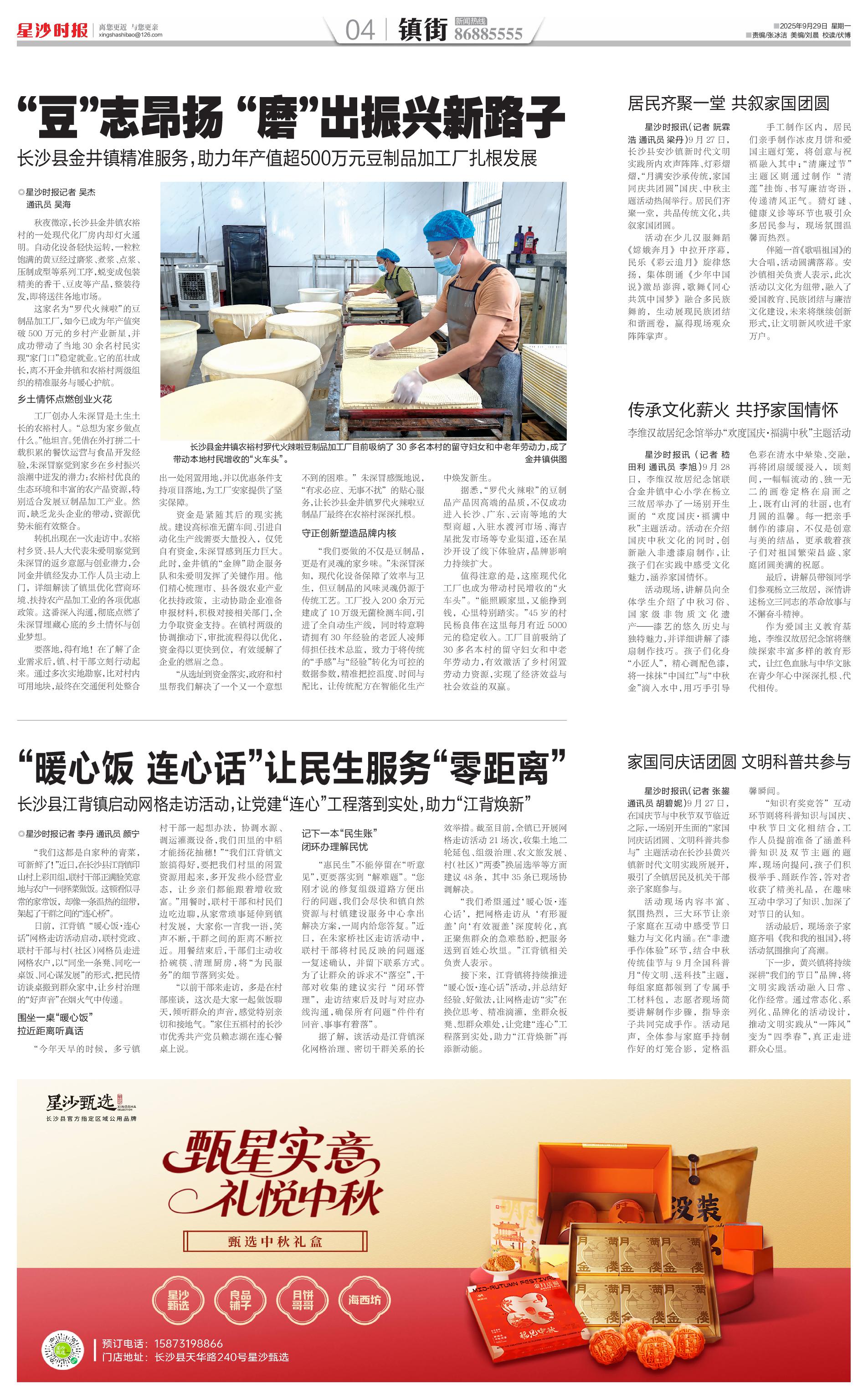 秋夜微凉,长沙县金井镇农裕村的一处现代化厂房内却灯火通明。自动化设备轻快运转,一粒粒饱满的黄豆经过磨浆、煮浆、点浆、压制成型等系列工序,蜕变成包装精美的香干、豆皮等产品,整装待发,即将送往各地市场。