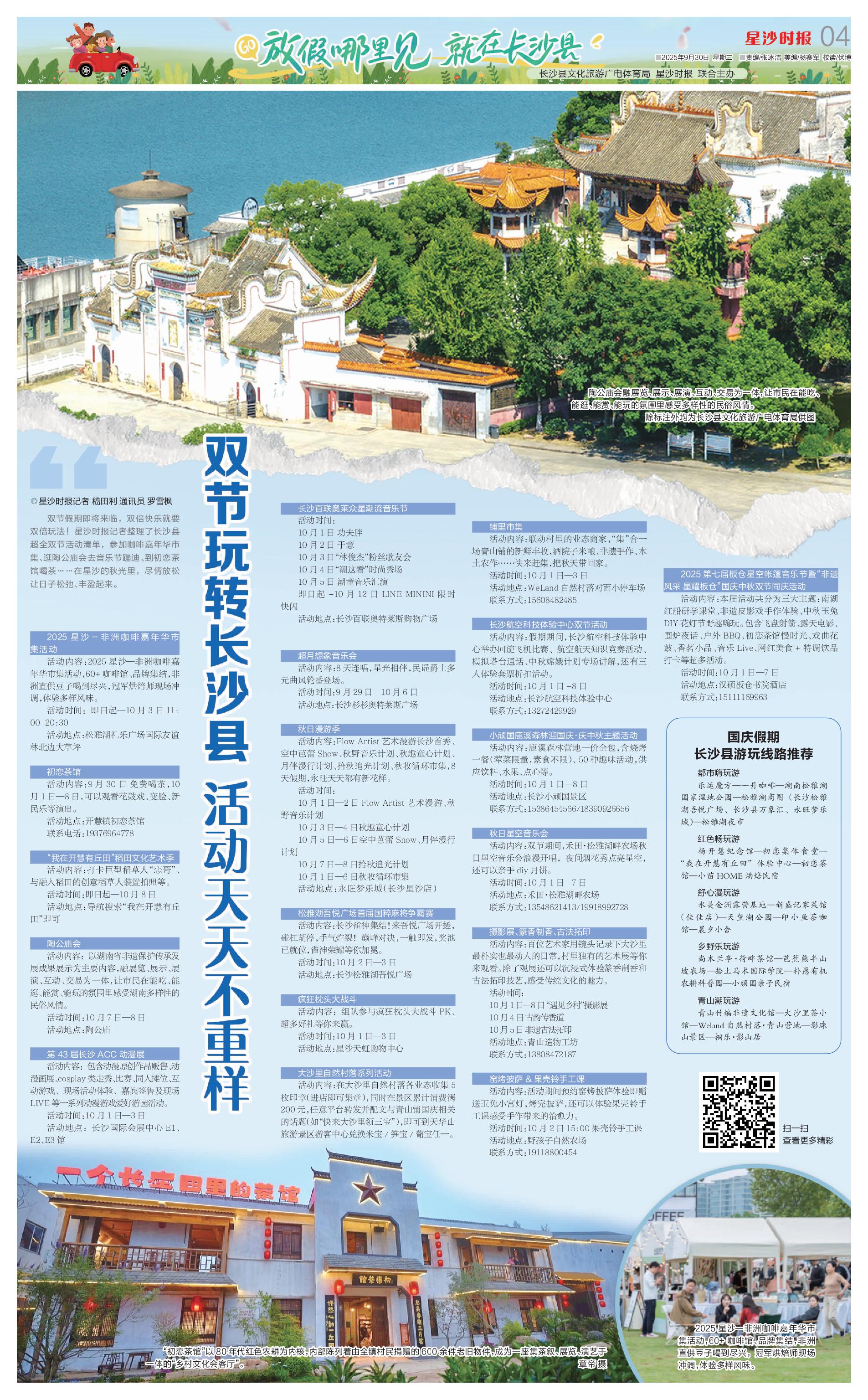 双节假期即将来临,双倍快乐就要双倍玩法!星沙时报记者整理了长沙县超全双节活动清单,参加咖啡嘉年华市集、逛陶公庙会去音乐节蹦迪、到初恋茶馆喝茶……在星沙的秋光里,尽情放松让日子松弛、丰盈起来。