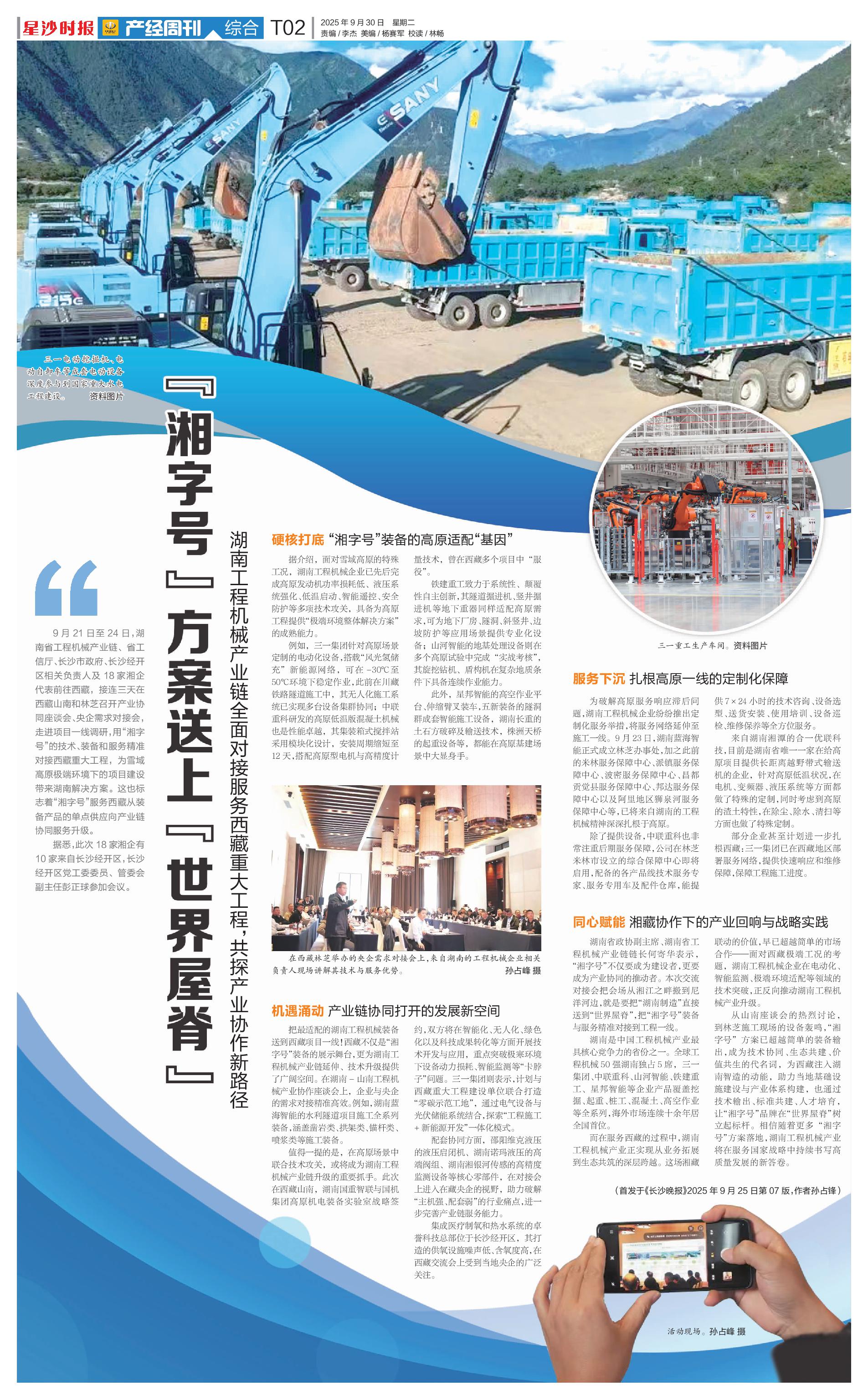 从山南座谈会的热烈讨论,到林芝施工现场的设备轰鸣,“湘字号”方案已超越简单的装备输出,成为技术协同、生态共建、价值共生的代名词,为西藏注入湖南智造的动能,助力当地基础设施建设与产业体系构建,也通过技术输出、标准共建、人才培育,让“湘字号”品牌在“世界屋脊”树立起标杆。相信随着更多“湘字号”方案落地,湖南工程机械产业将在服务国家战略中持续书写高质量发展的新答卷。