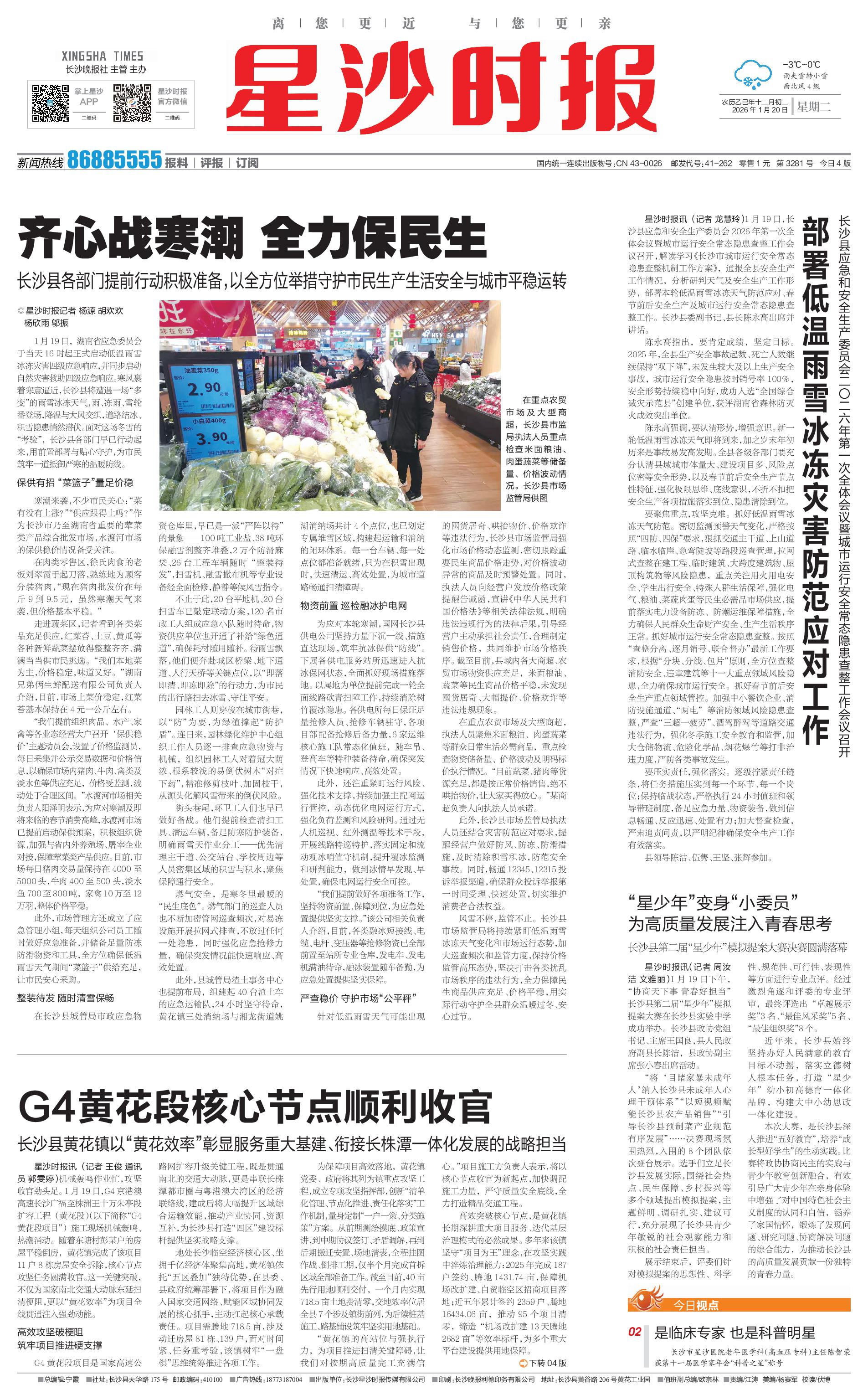 1月19日,湖南省应急委员会于当天16时起正式启动低温雨雪冰冻灾害四级应急响应,并同步启动自然灾害救助四级应急响应。寒风裹着寒意逼近,长沙县将遭遇一场“多变”的雨雪冰冻天气,雨、冻雨、雪轮番登场,降温与大风交织,道路结冰、积雪隐患悄然潜伏。面对这场冬雪的“考验”,长沙县各部门早已行动起来,用前置部署与贴心守护,为市民筑牢一道抵御严寒的温暖防线。