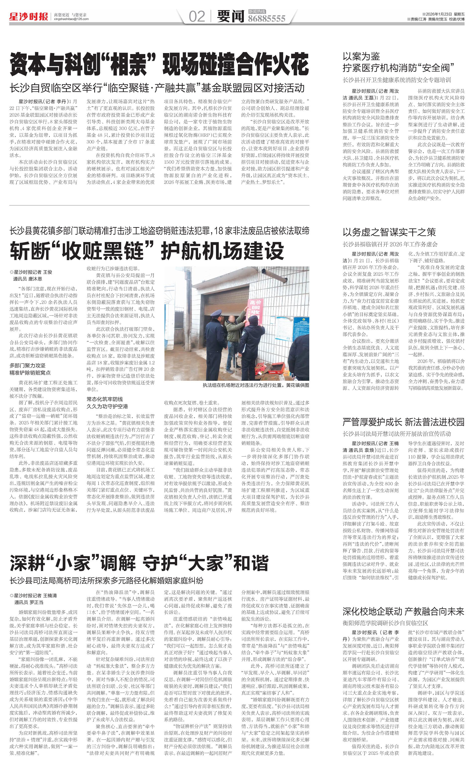 星沙时报讯(记者 李丹)1月22日下午,“临空聚链·产融共赢”2026基金联盟园区对接活动在长沙自贸临空区举行。8家头部投资机构、4家优质科创企业齐聚一堂,以基金为纽带,以项目为抓手,在精准对接中碰撞合作火花,为园区经济高质量发展注入金融活水。