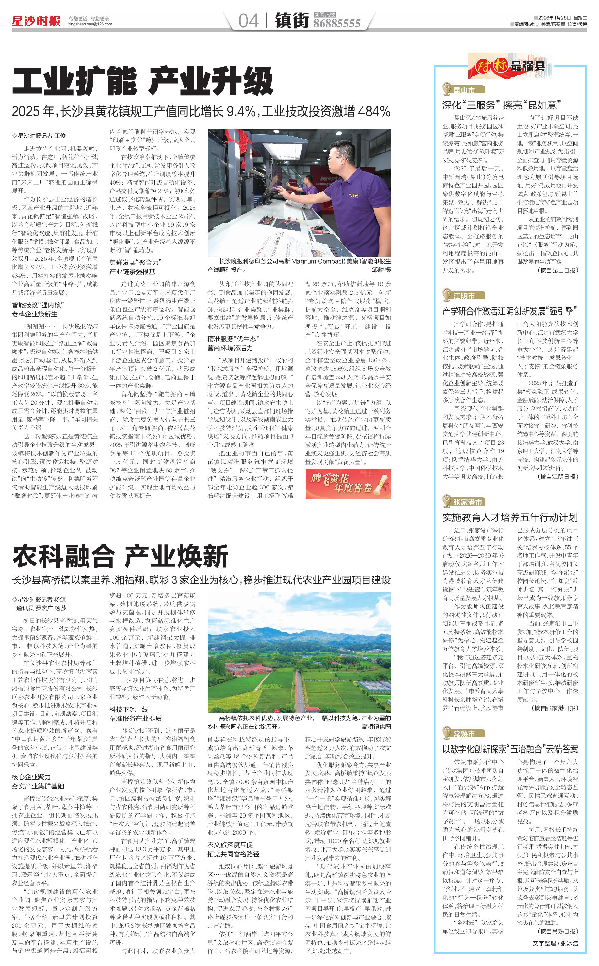 作为长沙县工业经济的增长极、区域产业升级的主阵地,近年来,黄花镇锚定“智造强镇”战略,以培育新质生产力为目标,创新推行“智能化改造、集群化发展、精准化服务”举措,推动印刷、食品加工等传统产业“老树发新芽”,实现质效双升。2025年,全镇规工产值同比增长9.4%,工业技改投资激增484%,用实打实的发展业绩奏响产业高质量升级的“冲锋号”,赋能县域经济高质量发展。
