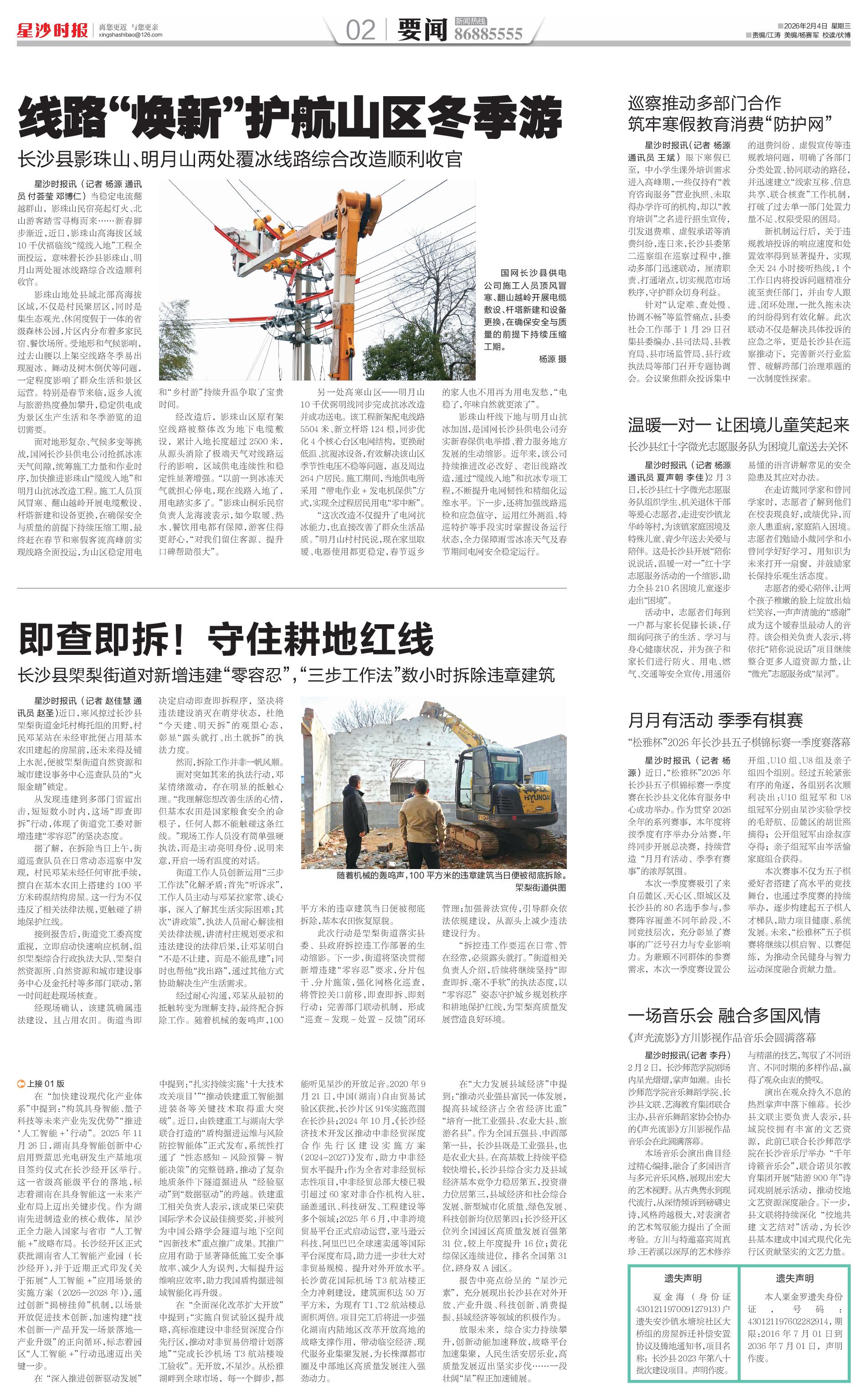 星沙时报讯(记者 杨源 通讯员 付荟莹 邓博仁)当稳定电流翻越群山,影珠山民宿亮起灯火、北山游客踏雪寻梅而来……新春脚步渐近,近日,影珠山高海拔区域10千伏福临线“缆线入地”工程全面投运,意味着长沙县影珠山、明月山两处覆冰线路综合改造顺利收官。