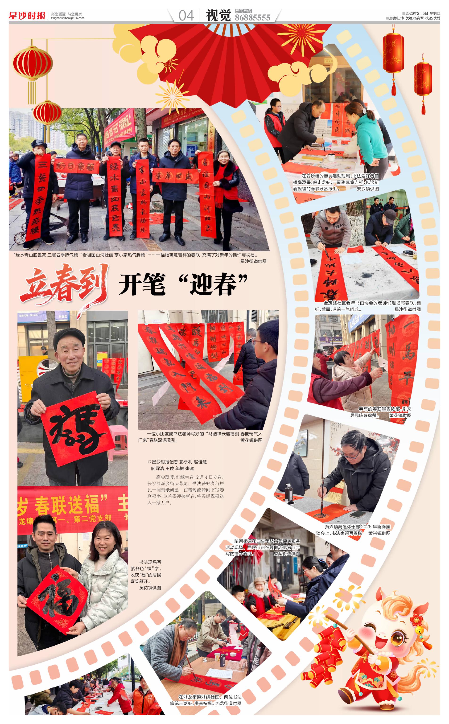 毫尖蕴暖,红纸生春。2月4日立春,长沙县城乡街头巷尾,书法爱好者与居民一同铺纸研墨,在笔韵流转间书写春联福字,以笔墨迎接新春,将温暖祝福送入千家万户。